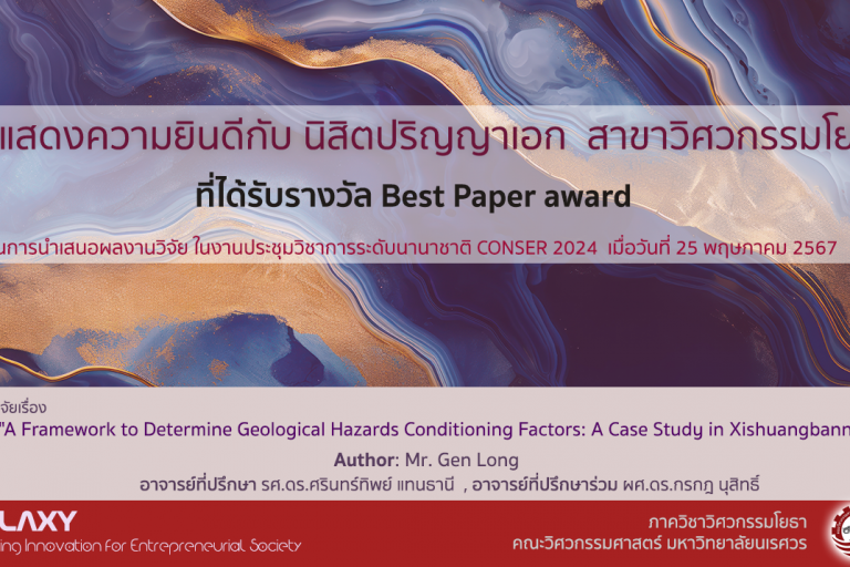 พ.ค.272024 ขอแสดงความยินดีกับปริญญาเอก สาขาวิศวกรรมโยธา และคณะนักวิจัย ที่ได้รับรางวัล Best Paper Award ในงานประชุมวิชาการระดับนานาชาติ CONSER 2024 นิสิต, ประชาสัมพันธ์, รางวัล Read more