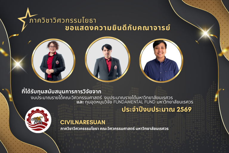 ขอแสดงความยินดีกับคณาจารย์ ที่ได้รับทุนสนับสนุนการวิจัยจากงบประมาณรายได้คณะวิศวกรรมศาสตร์ และงบประมาณรายได้มหาวิทยาลัยนเรศวร ประจำปีงบประมาณ 2569