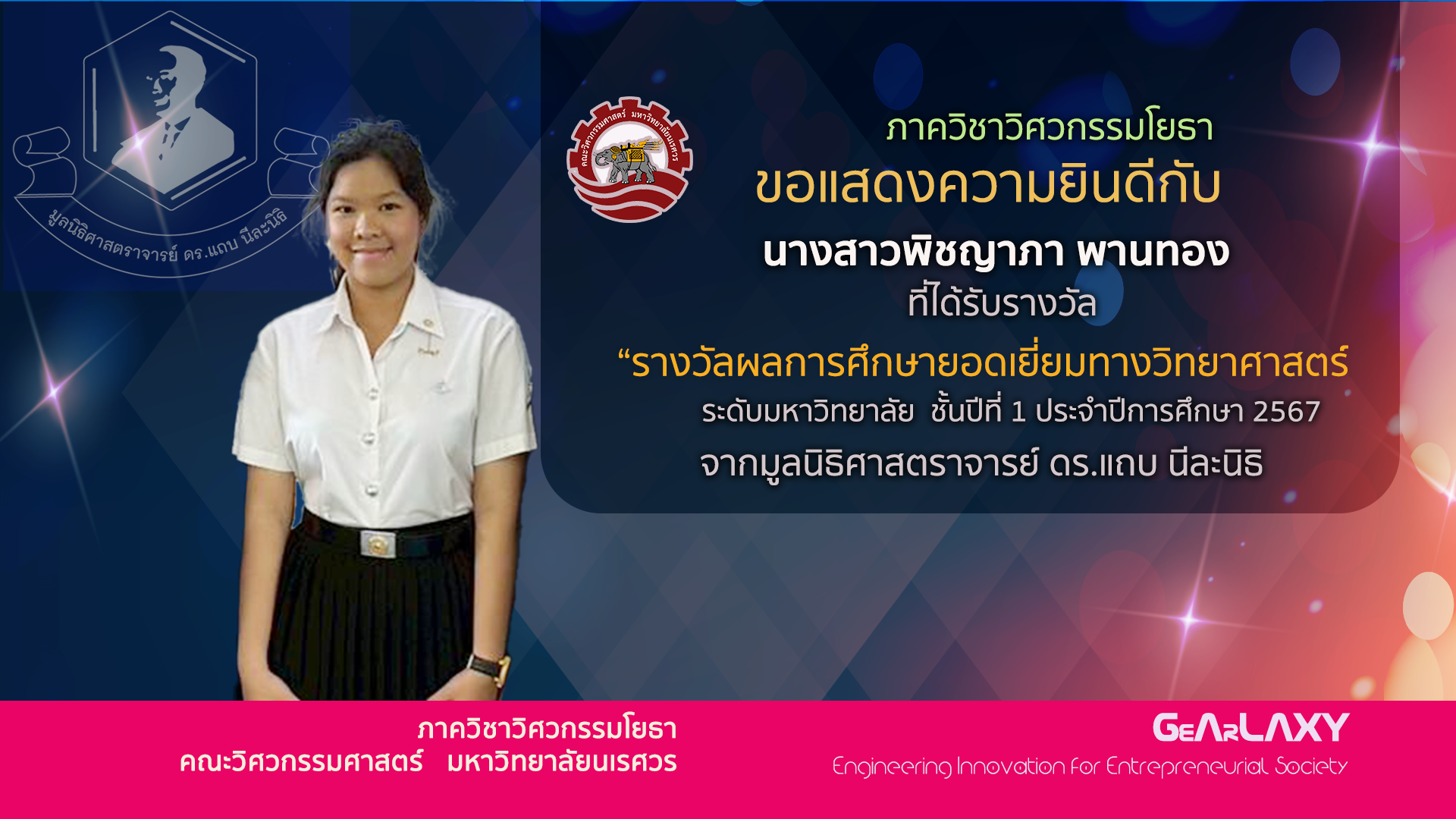 ภาควิชาวิศวกรรมโยธา ขอแสดงความยินดีกับ นางสาวพิชญาภา พานทอง นิสิตสาขาวิชาวิศวกรรมโยธา ภาควิชาวิศวกรรมโยธา ได้รับรางวัลผลการศึกษายอดเยี่ยมทางวิทยาศาสตร์ ระดับมหาวิทยาลัย ชั้นปีที่ 1 ประจำปีการศึกษา 2567 ของมูลนิธิศาสตราจารย์ ดร.แถบ นีละนิธิ