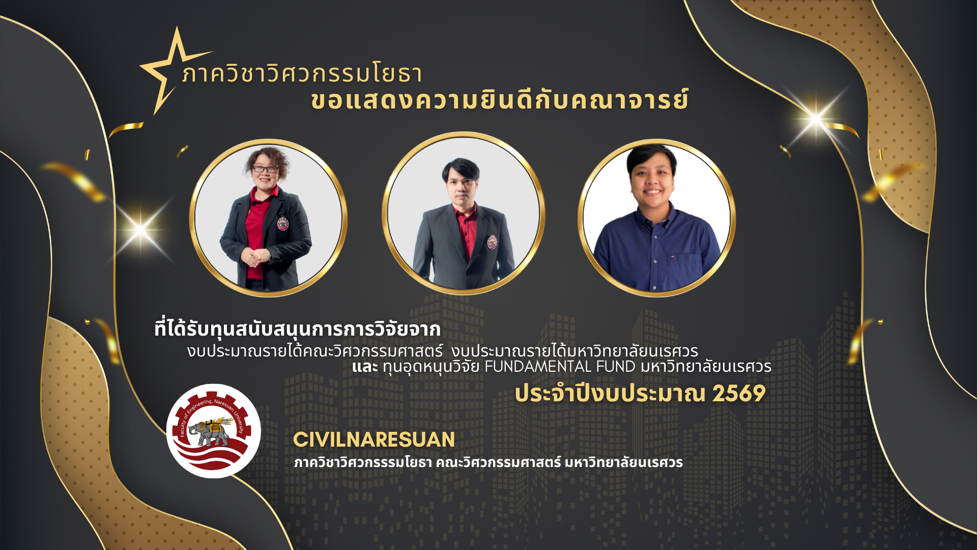ขอแสดงความยินดีกับคณาจารย์ ภาควิชาวิศวกรรมโยธา ที่ได้รับทุนสนับสนุนการวิจัยจากงบประมาณรายได้คณะวิศวกรรมศาสตร์ และงบประมาณรายได้มหาวิทยาลัยนเรศวร ประจำปีงบประมาณ 2569